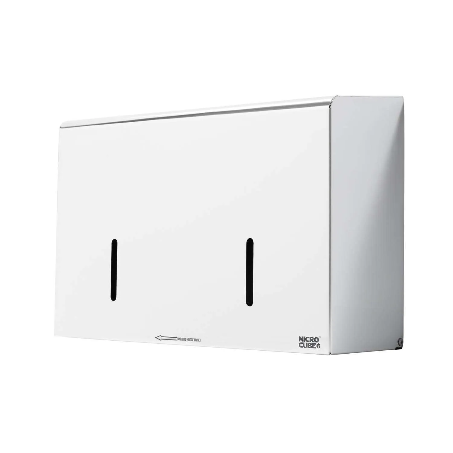 Holds two Micro Jumbo rolls (140mm Diameter – 37mm Core) (140mm Diameter – 42mm Core) (145mm Diameter – 42mm Core) Key Lockable for added security Screws and plugs supplied for fitting into a solid wall 304L Grade Stainless Steel / 240g
