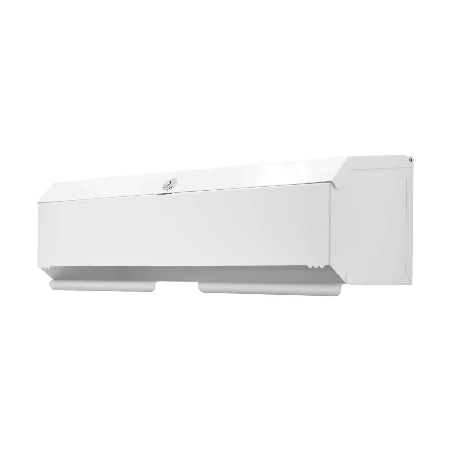 A versatile and easy to use dispenser for couch rolls. The unit is constructed in mild steel with a white powder coat epoxy finish. The dispenser is durable with a fully lockable slim line chrome lock. Made in a white powder coat epoxy finish. Designed and built in the UK.