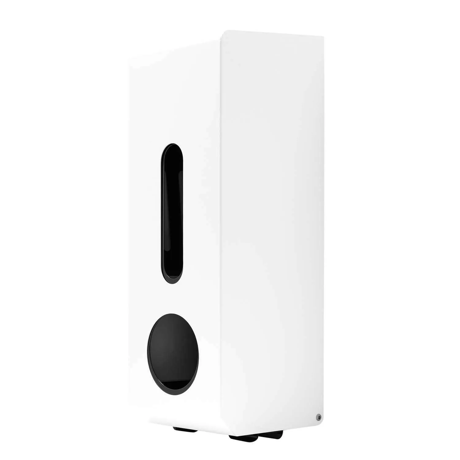 An innovative design enabling storage of up to 3 standard toilet rolls. Reserve rolls are put into place manually with use of a finger pushing down on the rolls through the finger slots. All hand contact areas are protected by powder coated steel insert. Made in a white powder coat epoxy finish. Designed and built in the UK.